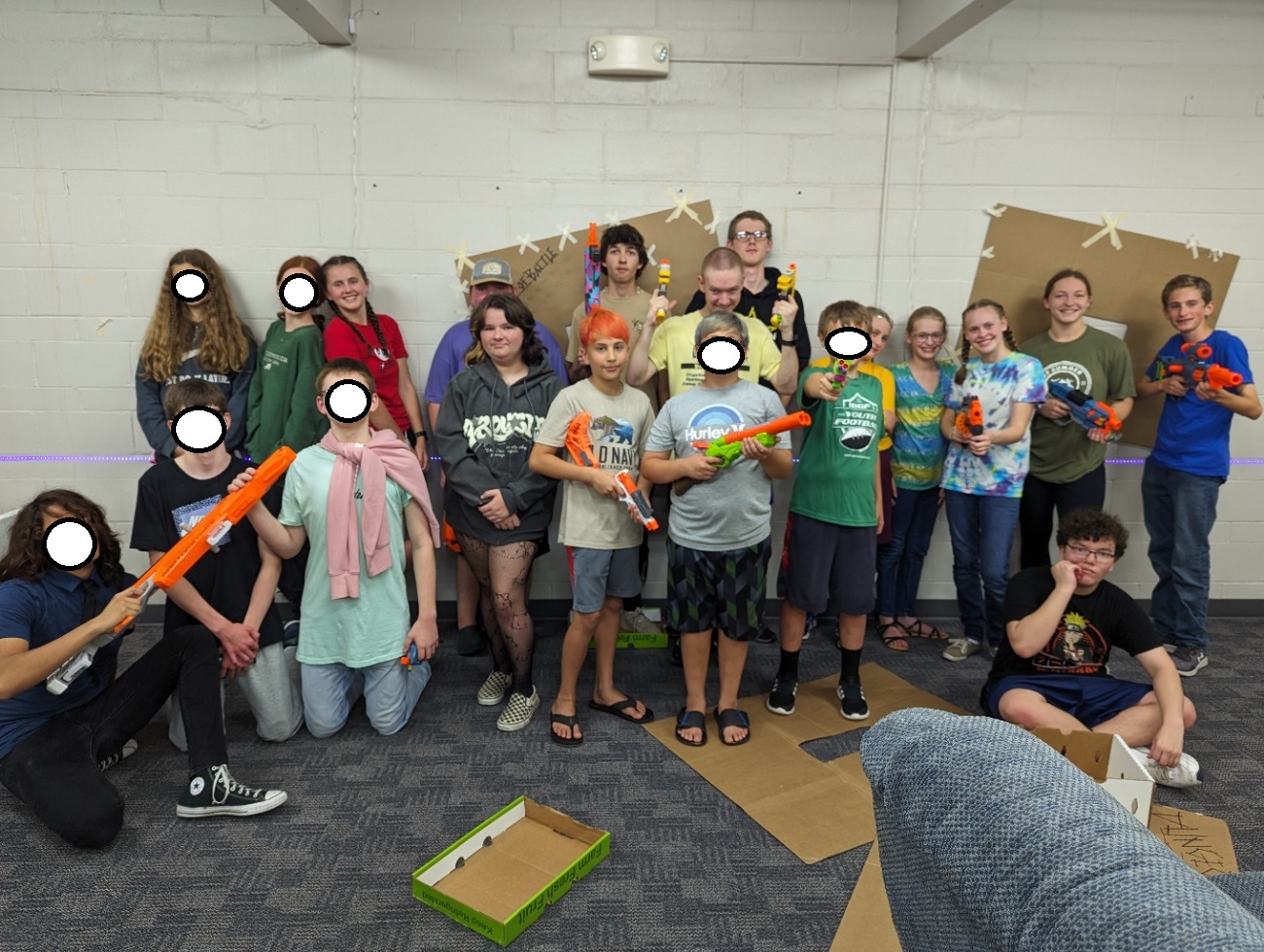 On the week of Sept. 27th, we prepared The Lighthouse to be transformed into a safe, fun, and fair nerf battle for teens. With the rescheduling of this event, I was uncertain how many would come or how it would go, but I was trusting God to bring who He wanted while being faithful with what He had already asked of us. On the afternoon of the event, we set ice cream and root beer outside The Lighthouse and were ready to greet any teen to help them feel included, welcomed, and cared for. It was exciting to see that as the afternoon went on, 20 teens trickled in after their school day from six different area schools to compete in a fun battle at The Lighthouse! Teens were not separated by their differences or school rivalries but came together for fun! I witnessed many encouraging scenes, from different young people welcoming new teens who arrived at the battle after it began, to individuals working together to bring out each other's uniqueness and strengths. We had the opportunity to also show teens that you can nerf battle each other in right and good ways as we competed based on a point system with no pretended casualties and for a silly, but fair cause! There was much laughter and activity. We hope to do something like this again in the future years as it seemed to be geared toward a wide amount of teens' interest.