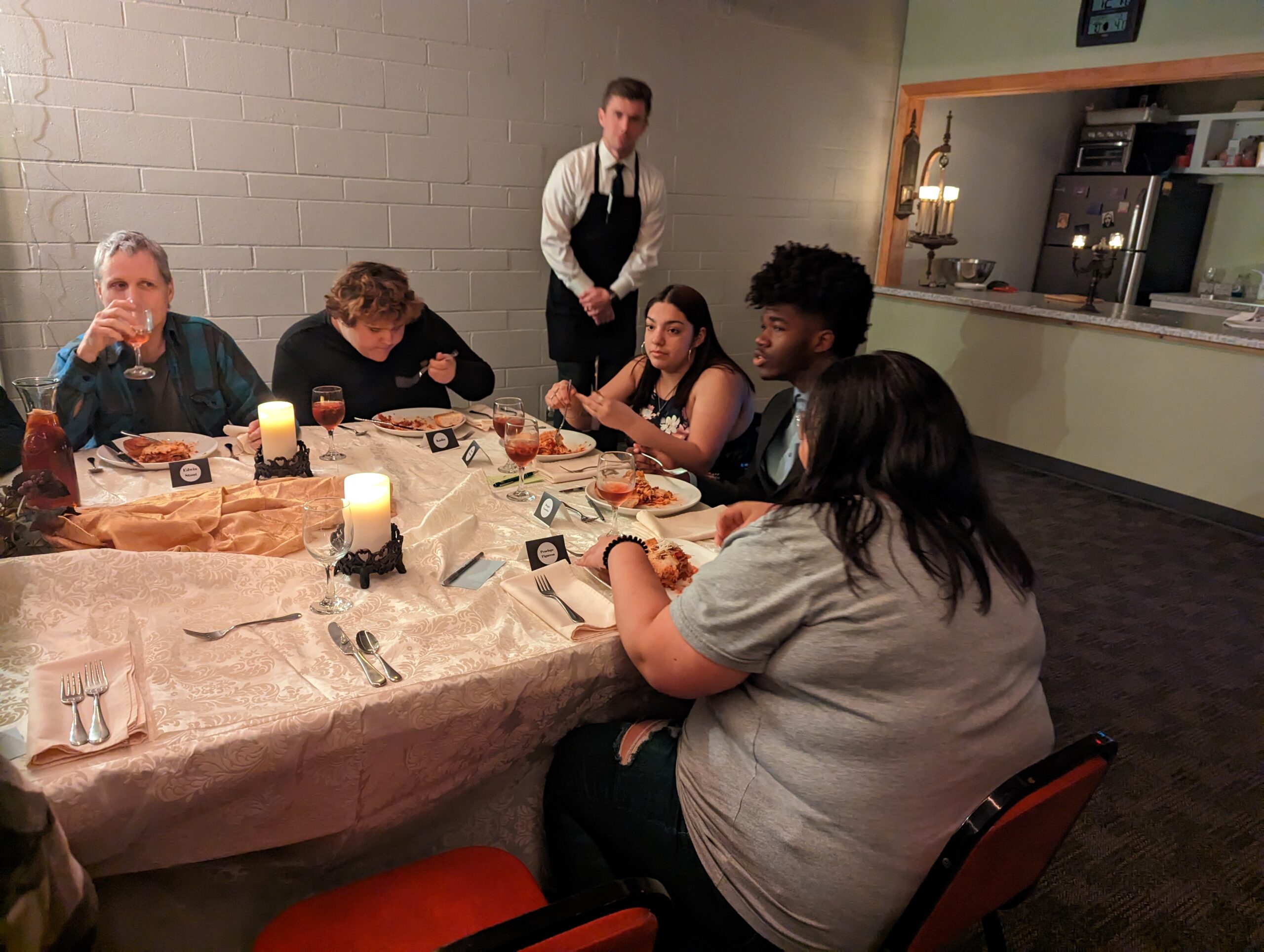 Eighteen students joined us on Saturday, February 11th for the mysterious Malachai Stout Family Reunion meal! They were greeted at the door by two of the Stout butlers who escorted them to the back of the "Malachai Mansion" where they entered the family dining room. The meal proceeded with three courses of food cooked by the Stout Chef (a renowned chef that partnered with us to use his talents to create a great meal and environment for this event) and served individually to each student and Stout family member. Abruptly mid-way through the meal, a mystery had occurred and required to students' help to investigate and solve it! These eighteen students from five different local schools came together and solved the mystery right before the meal ended! It was an awesome afternoon filled with fun, laughter, interrogation of the Stout family, and imagination! We were grateful we had the opportunity to serve these teens with the love God has for us and witness them come together as one "big family" to remember they are not alone this month. It was great to watch their "real selves" come to the surface as they all investigated the mystery in their own unique way (from observing and listening to questioning and finding loopholes in the Stout character stories)! You can see pictures below, and more will follow as we keep collecting them from the individual event photographers.